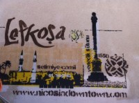 I experimented with i’mgoogle.com-inspired format (circular slideshow with sound). It was too closed to be dialogic. A photo of Nicosia’s ‘walk the walled city’ graphic provided the centre for a solution: I set type to reflect its circular path, other images fold out from it, each layout loosely organised by topic (e.g. occupation, development) and visual content. A dialogue opened between walker/reader and images.