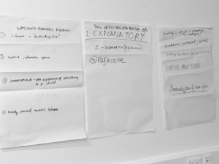 We used visual tools to analyse the piece as a group. This lead us to focus on Bruinsma’s insight about growing overlap and flattening of hierarchy between watching/reading, and between oversight/insight.