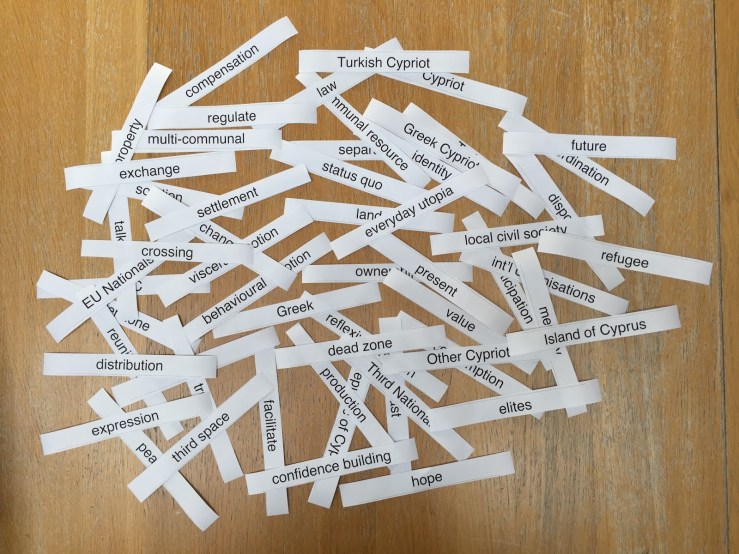 I noted key concepts in pencil on the title page of each book I read, typed them up, printed them out, cut them into strips, dropped them on a counter and looked hard. This was an extremely valuable process. A key part of any research process is generating a conceptual vocabulary that brings together a new argument. This almost always requires a degree of translation. This experiment made the scope of that task very visible.