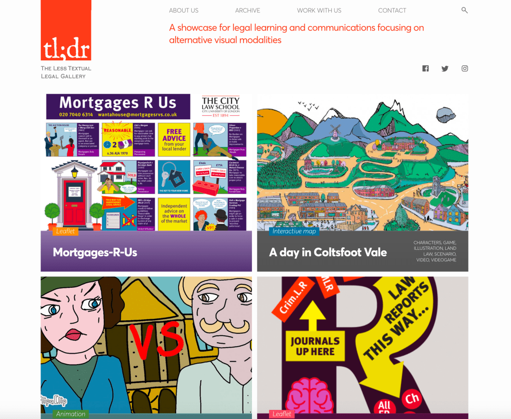 A second site, TL;DR (social media shorthand for ‘too long, didn’t read’), goes further by prompting and facilitating law students and academics without design expertise to experiment with designing legal information and sharing the results via the site. As with sprints, a key message from TL;DR is that there is no need to worry about artistic ability. Most significantly perhaps, the site carves out a space in which students and academics can engage with each other through a wide range of designed materials including visual explainers, whiteboard animations, graphic novels, factsheets, animations, interactive games, videos. Each source includes a description of how and why it was created to give confidence to others to take up the baton and discover how the process of designing legal information can aid comprehension and retention of it.