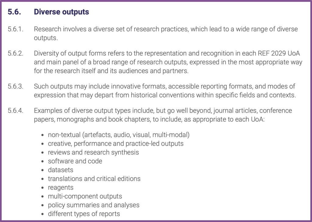 The REF2029 guidance retains the REF2021 definition of research outputs. It also follows REF2021 in noting that research outputs ‘go well beyond journal articles, conference papers, monographs and book chapters’ (5.6.4); and ‘may include innovative formats, accessible reporting formats, and modes of expression that may depart from historical conventions within specific fields and contexts’ (5.6.3).